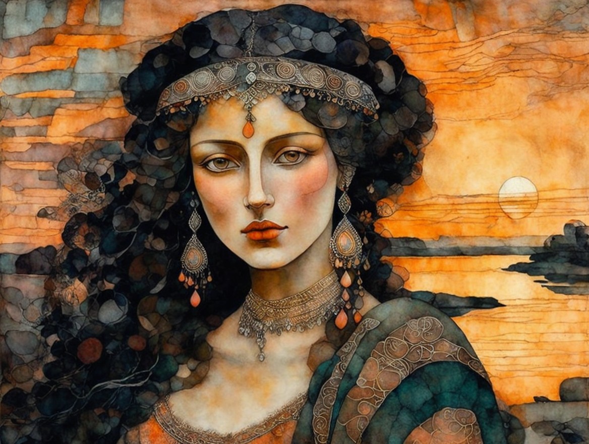 The image features a woman with long, flowing hair, adorned with large earrings and intricate jewelry, set against an abstract, warm-toned background filled with organic shapes and textures.