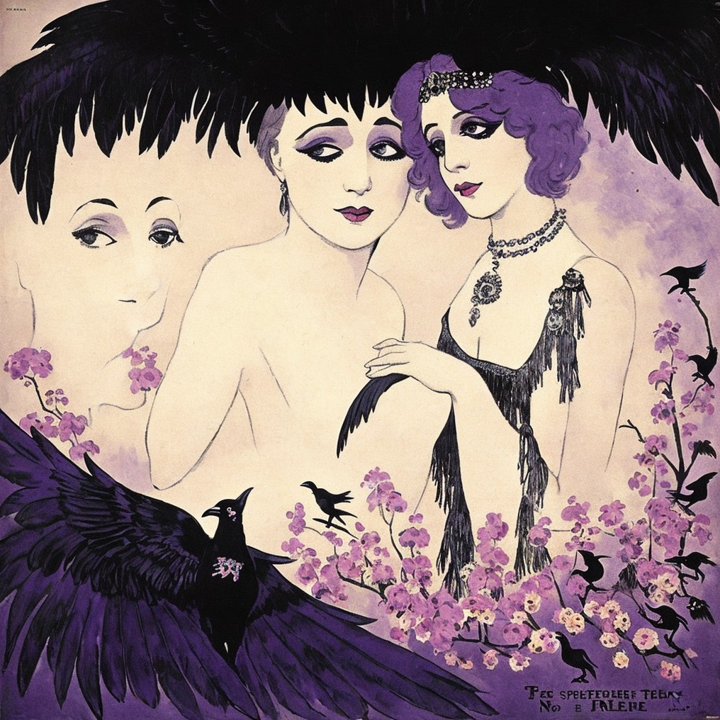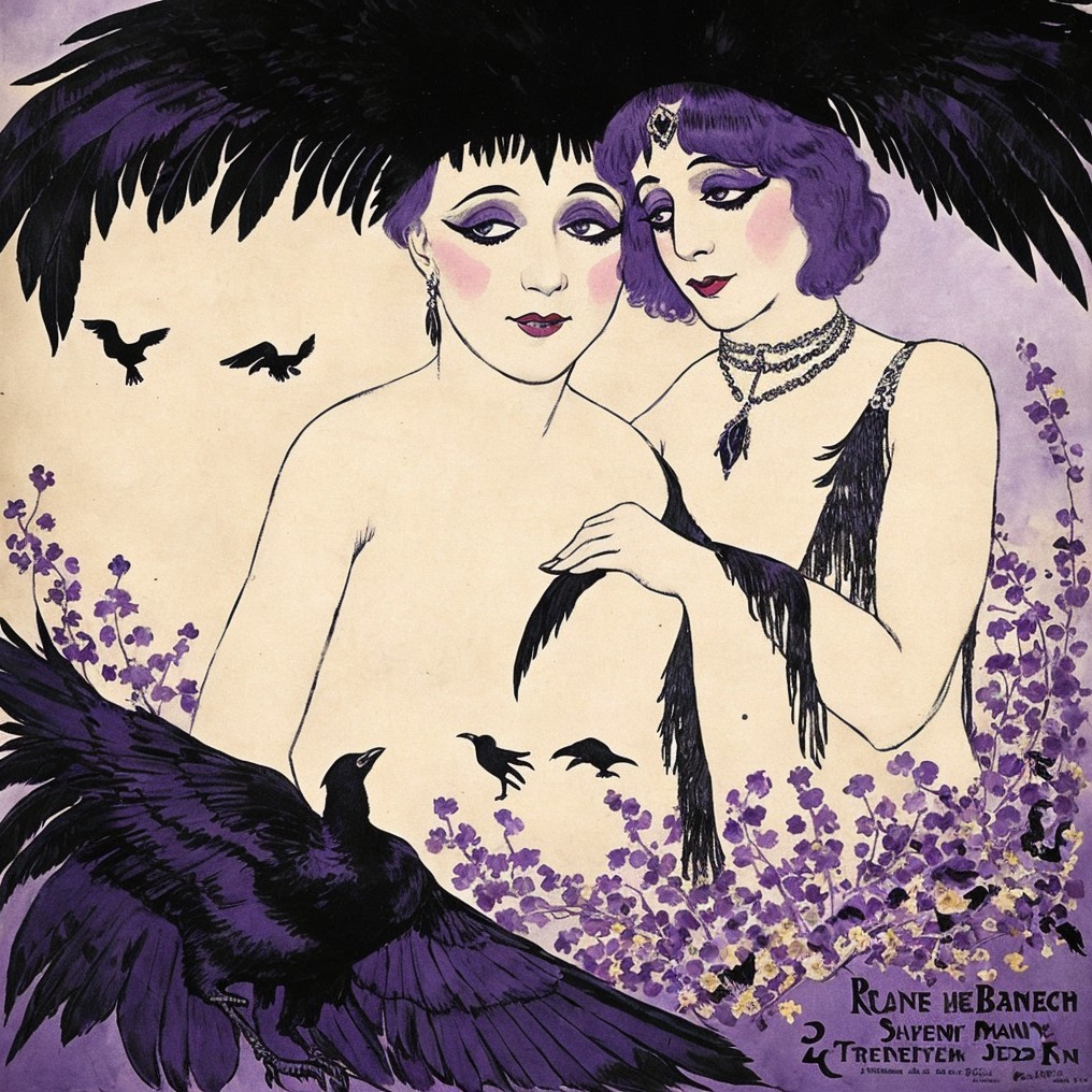 Art Nouveau style illustration with three women with bob cuts, one holding a black feather, surrounded by purple flowers and decorative text.