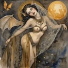 “angel of night, of history and death and of light”. Dark gothic gypsy sorcerer bat woman of the night, spider web veil, in the style of Wolfe Von Lenkiewicz ,style klimt e Van Gogh