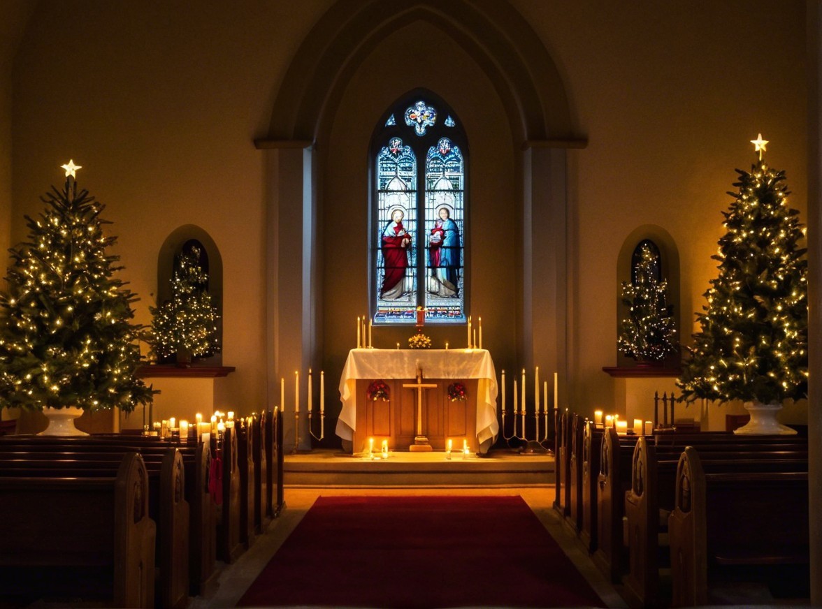 A serene church interior features a beautifully decorated altar with candles, flanked by Christmas trees adorned with lights, and vibrant stained glass windows illuminating the space.