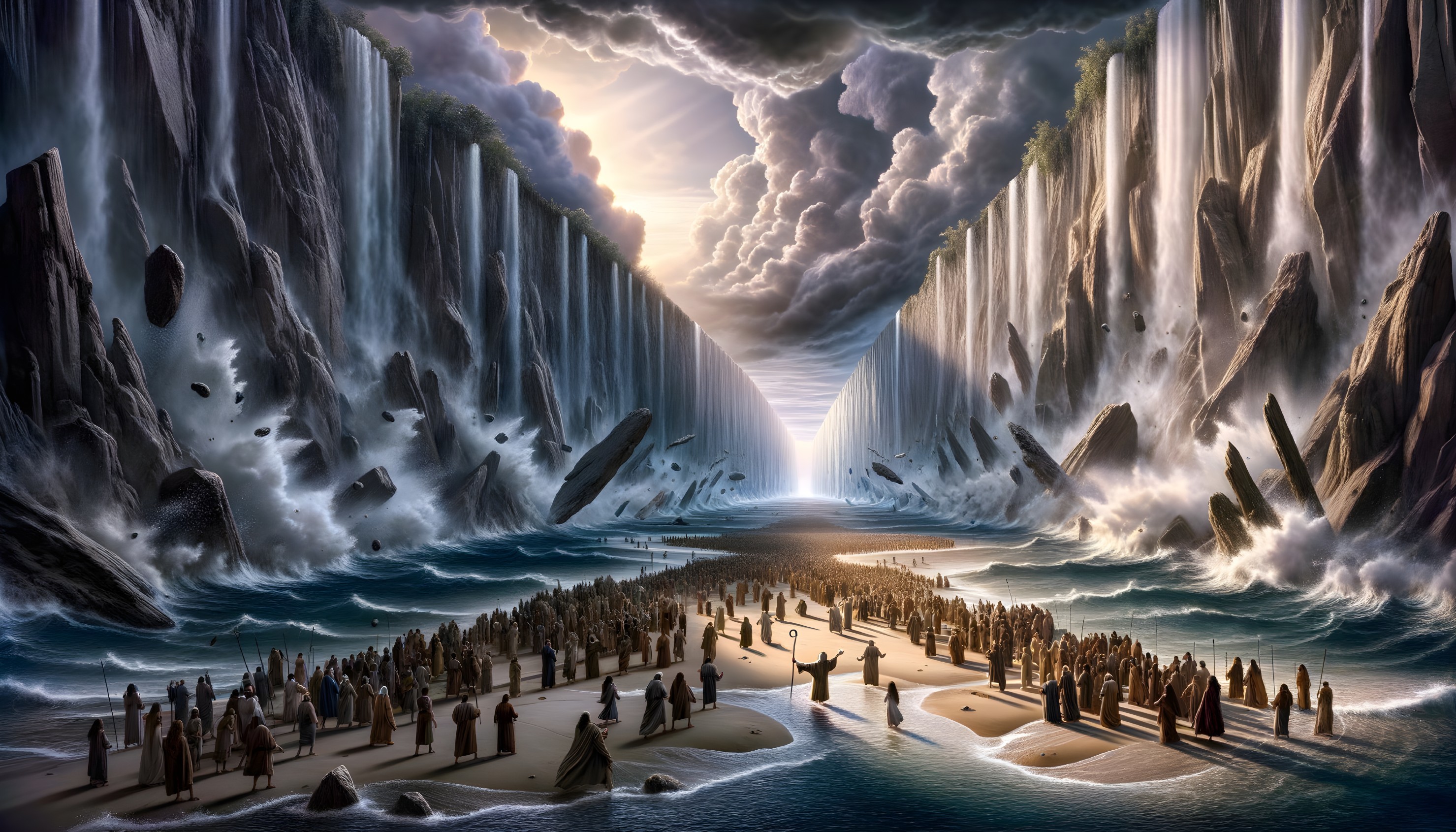 The splitting of the Red Sea is a pivotal event in the biblical narrative, recounted in the Book of Exodus. Imagine the scene: The Israelites, a multitude of people, stand on the shore of the Red Sea, their backs against the vast expanse of water. Behind them, the dust clouds kicked up by the approaching Egyptian army signal imminent danger. The atmosphere is tense with fear and uncertainty. Moses, a figure of profound spiritual authority, raises his staff, and a mighty wind begins to stir. The sea, under the divine command, responds to this celestial intervention. The waters of the Red Sea dramatically part, creating a colossal corridor flanked by towering walls of water on either side. As the Israelites gaze in awe and trepidation, a dry path emerges through the midst of the parted sea. The sea floor, now exposed, is a surreal landscape as the people witness the raw power of the divine at work. The walls of water stand as a testimony to the miraculous nature of the event. The Israelites, guided by the divine pillar of cloud and fire, embark on this miraculous journey through the parted waters. The sea, held back by the divine hand, becomes a symbol of both salvation and separation—a barrier between the enslaved past and the promise of freedom on the other side. As the last of the Israelites tread on the dry ground, the Egyptian army, emboldened by their pursuit, ventures into the corridor between the towering walls of water. At this critical juncture, the divine intervention ceases, and the waters return to their natural state, crashing down upon the Egyptian army in a spectacular display of nature's reclamation. The splitting of the Red Sea is a symbol of divine deliverance and a powerful demonstration of faith. It marks a turning point in the Israelites' journey toward freedom, reinforcing the notion of divine guidance and protection throughout their arduous quest for a promised land.