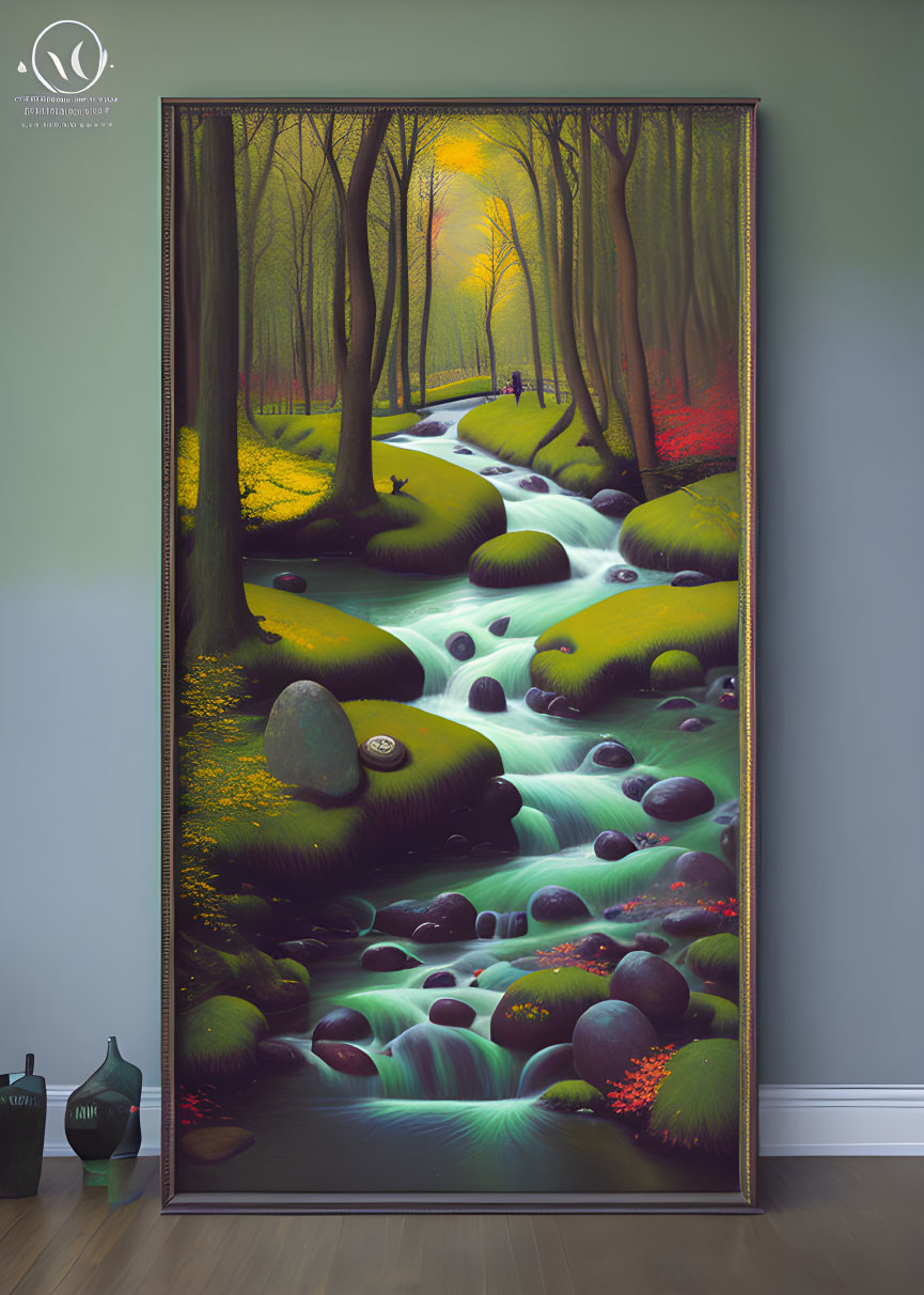 + Prompt:The stream through the woods, very subtle changes in saturation in the deep distance. Pale greyish, pastel Turquoise, pinks, blue, orange, yellow, brown, red,