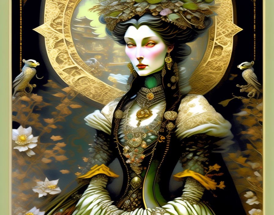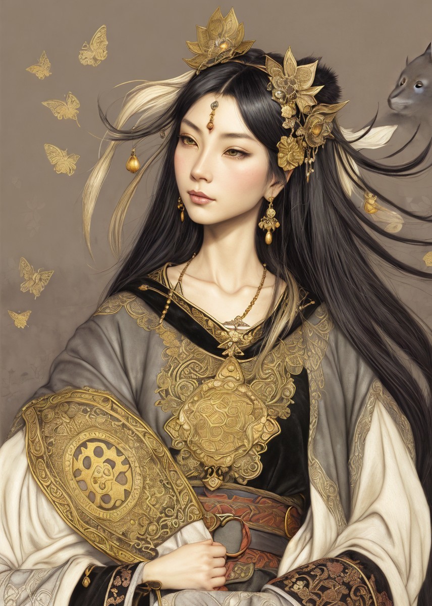 Legend of the Girl and the panther, Medieval Japanese Artists Sumi-e Style, Velvet Black, Shabby, Dull Gold, Amber Gray, Golden Ratio, Surreal Fantasy, Elegant, High Definition Ultra Fine 3D Line, Zenangle Style, Watercolor Patchwork , Arthur Rackham Style, Paul Kidby, Gediminas Prankevicius, Jacek Jerka, Extremely Detailed, Intricate, Thoughtful, HDR, Fractal, Beautiful, Award Winning, Fantasy Look, Fantasy, Crisp Quality