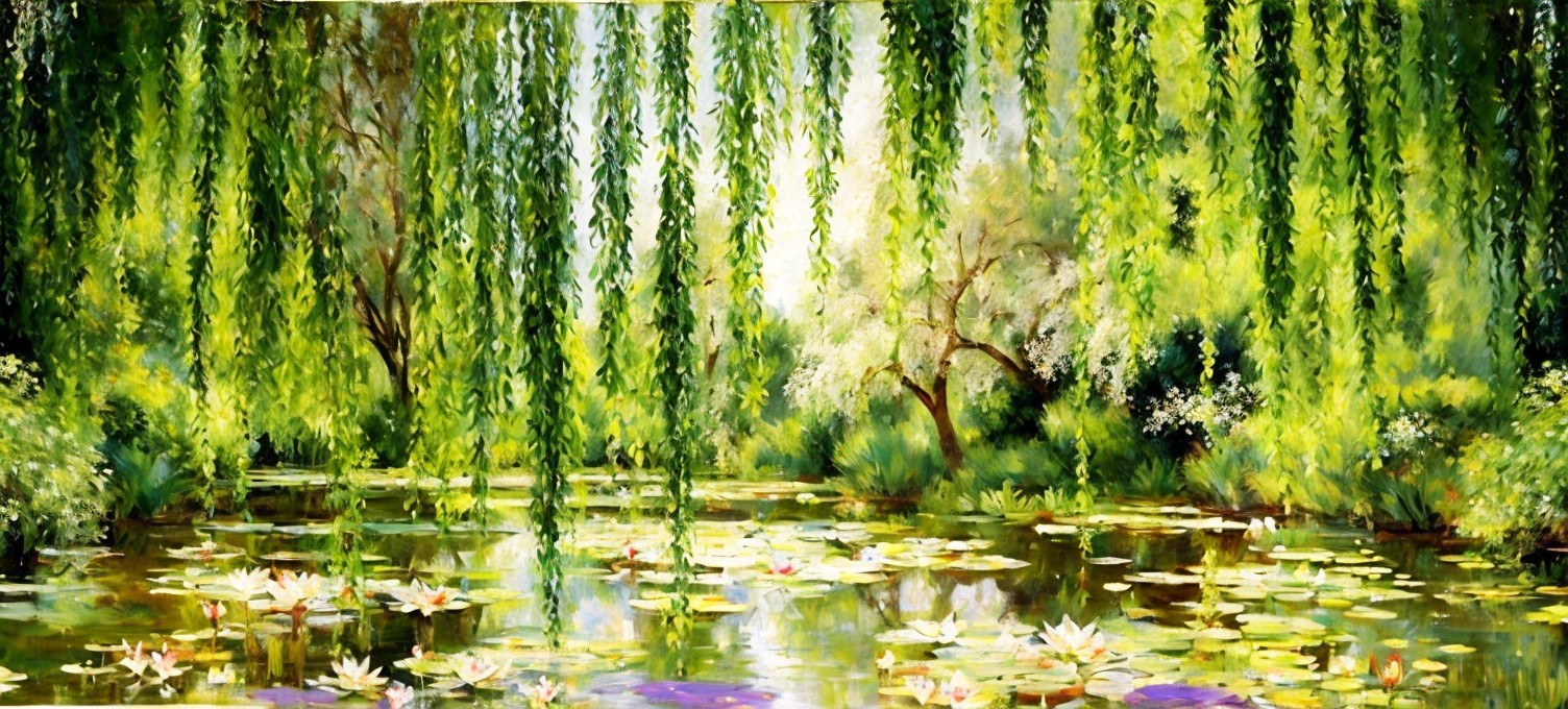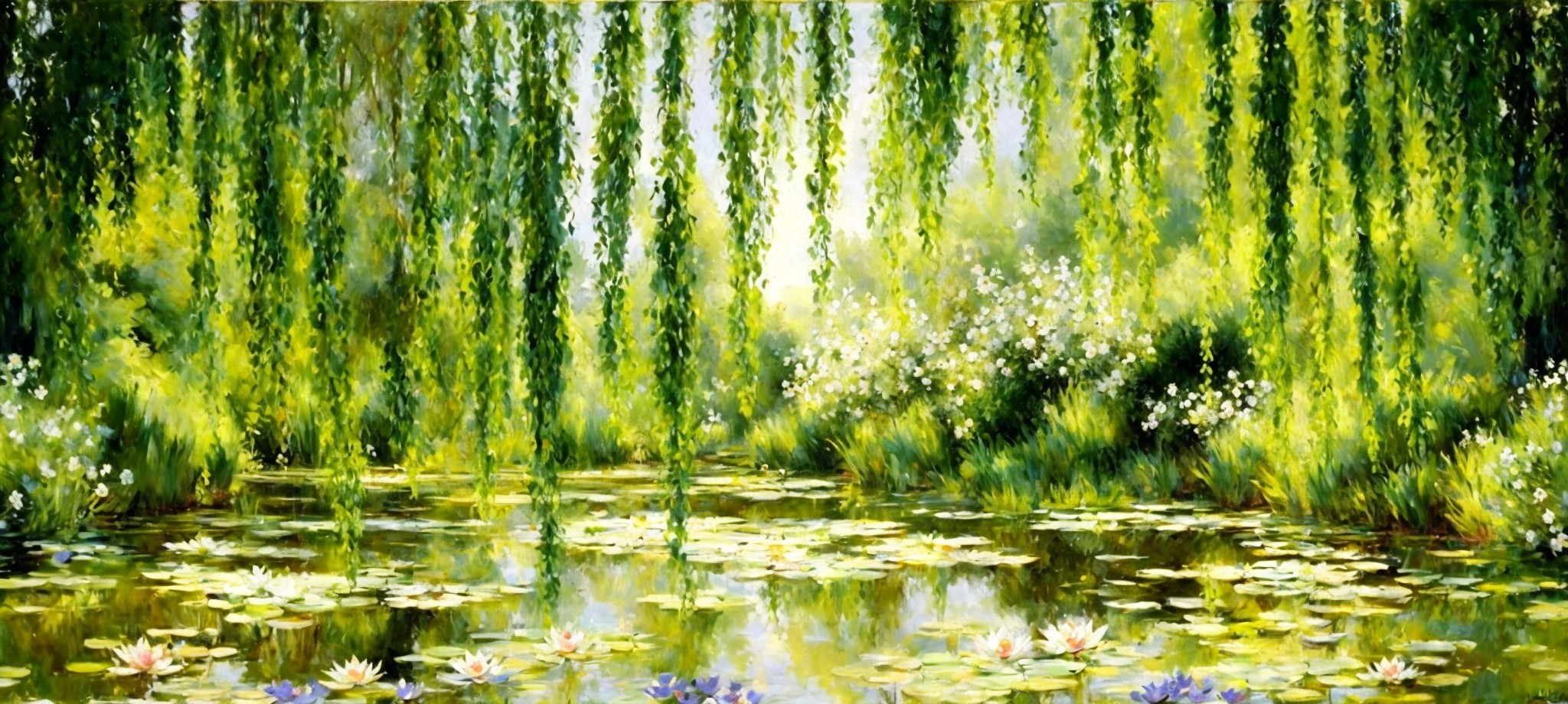 Tranquil Pond Surrounded by Lush Greenery and Lilies
