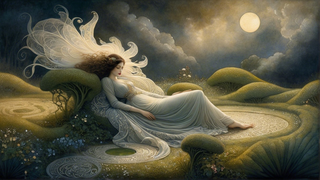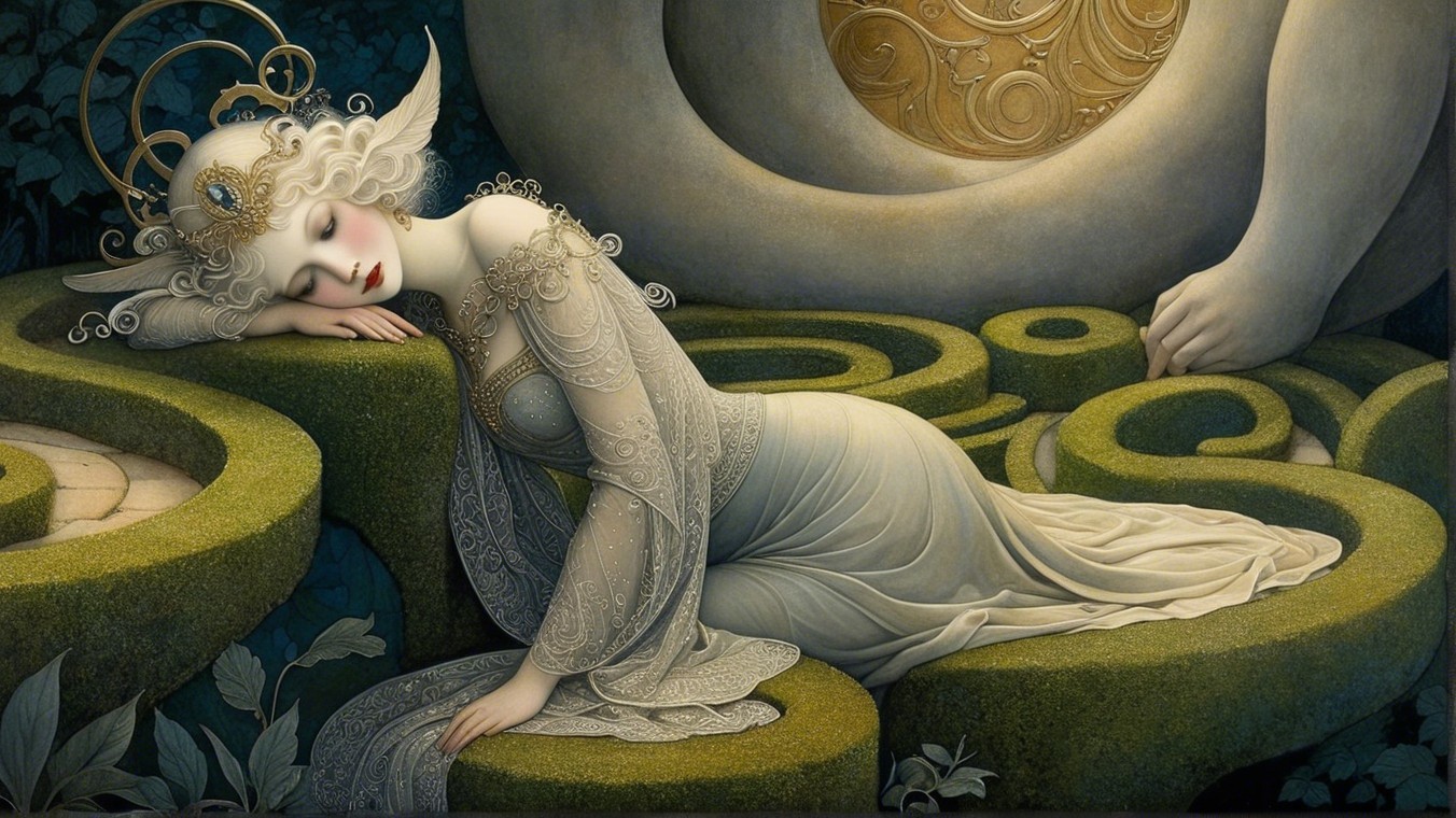 A serene figure with delicate features rests on a manicured hedge in a mystical garden. Draped in elegant attire, she embodies ethereal beauty, surrounded by whispers of nature under a golden moon.
