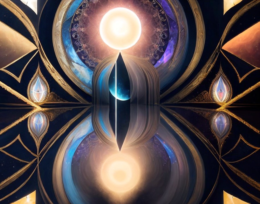 A fantastical illustration of a female figure with celestial motifs, ornate headdress, and ethereal wings.