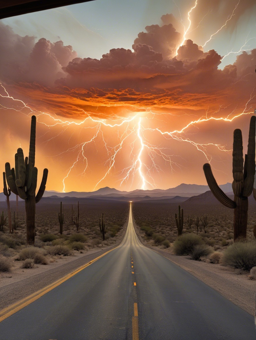 Dramatic Desert Landscape with Cacti and Stormy Sky