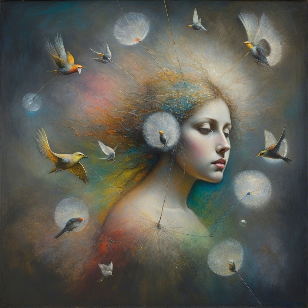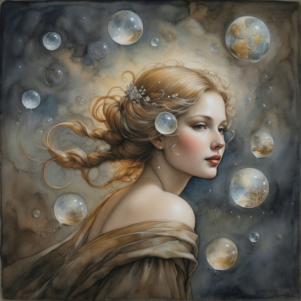 A captivating portrait of a woman with flowing hair and elegant attire, adorned with floral accessories, set against a backdrop of musical notes and celestial orbs.