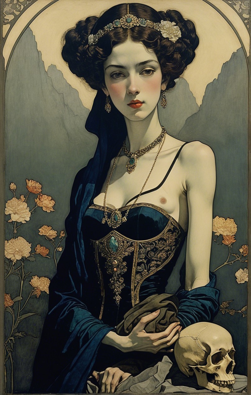 A graceful woman in an elegant dark blue gown adorned with gold and turquoise accents. She has cascading dark curls, a floral headpiece, and stands against a dramatic mountain backdrop.
