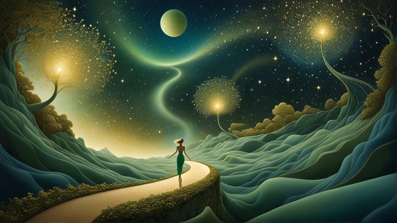 A mystical scene featuring a serene woman with flowing dark hair, adorned in intricate blue garments. Two vibrant birds sit beside her, set against a dreamy night sky and lush foliage.