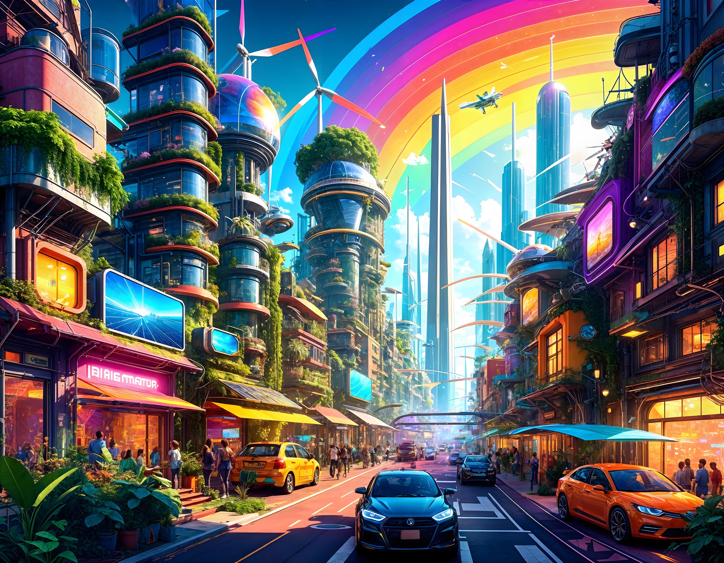 A stunning solarpunk cityscape blends futuristic technology with nature, featuring lush greenery, solar panels, and vibrant murals. The scene is alive with flying vehicles, neon lights, and whimsical details.