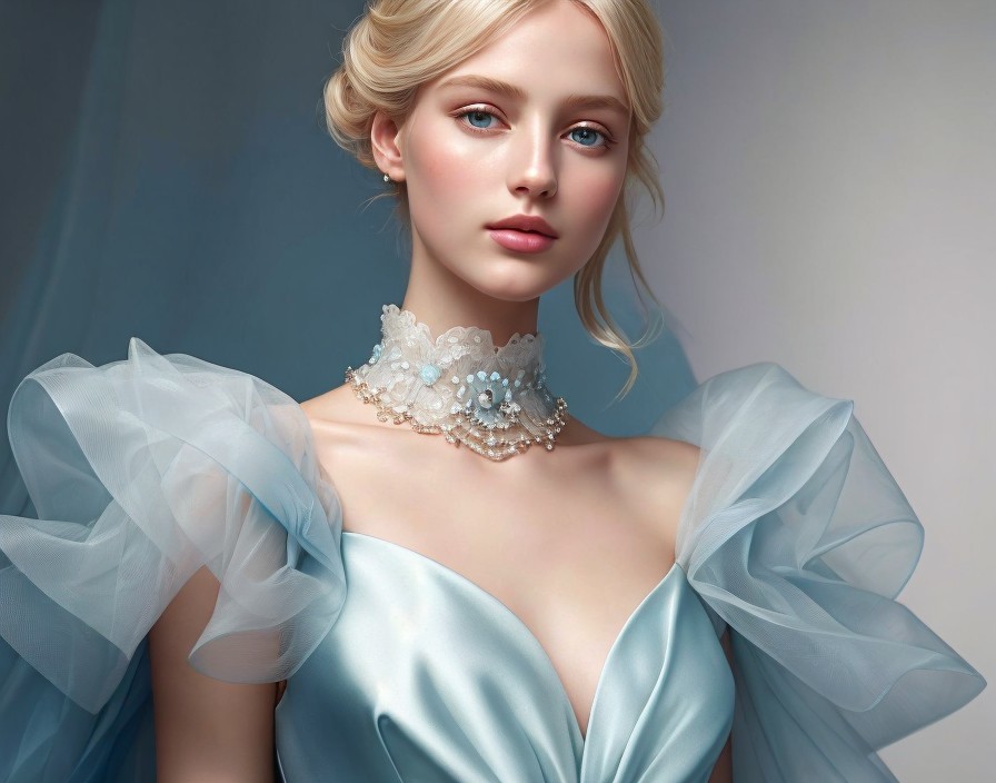 A woman with blond hair and a blue satin dress adorned with a delicate floral necklace, exuding elegance.