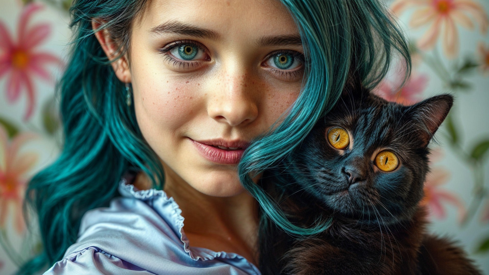 (Try from Regina) - A girl with striking turquoise hair and freckles smiles gently, holding a black cat close. They are surrounded by a floral background, creating a warm, endearing atmosphere.