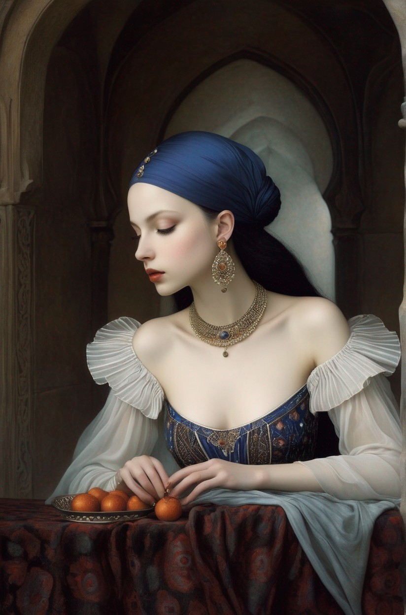 Medieval woman in blue gown holding white cat against ornate backdrop