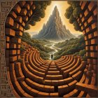 A figure stands in a labyrinth, gazing towards a castle of rules and power.