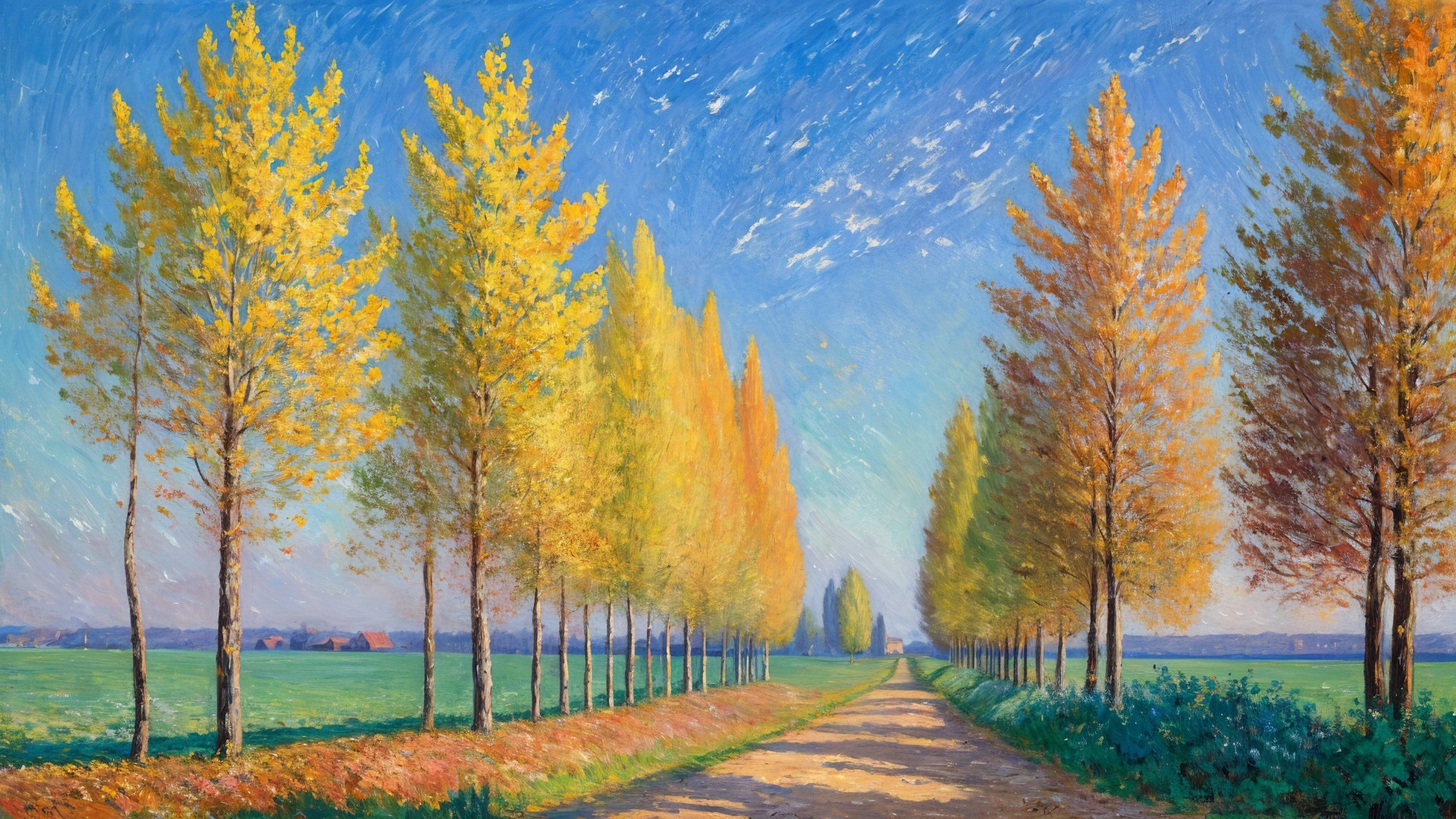 A scenic landscape features tall, golden poplar trees lining a dirt road that leads towards the horizon, framed by vibrant autumn foliage and a glowing sunset in a tranquil rural setting.