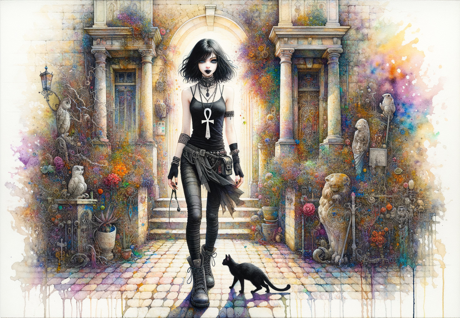 A detailed watercolour painting in the style of renowned artists, featuring a striking 18-year-old female in black attire on apartment steps with a black cat. The artwork is rich, layered, and vibrant, exuding a fantasy art vibe with a grunge aesthetic.