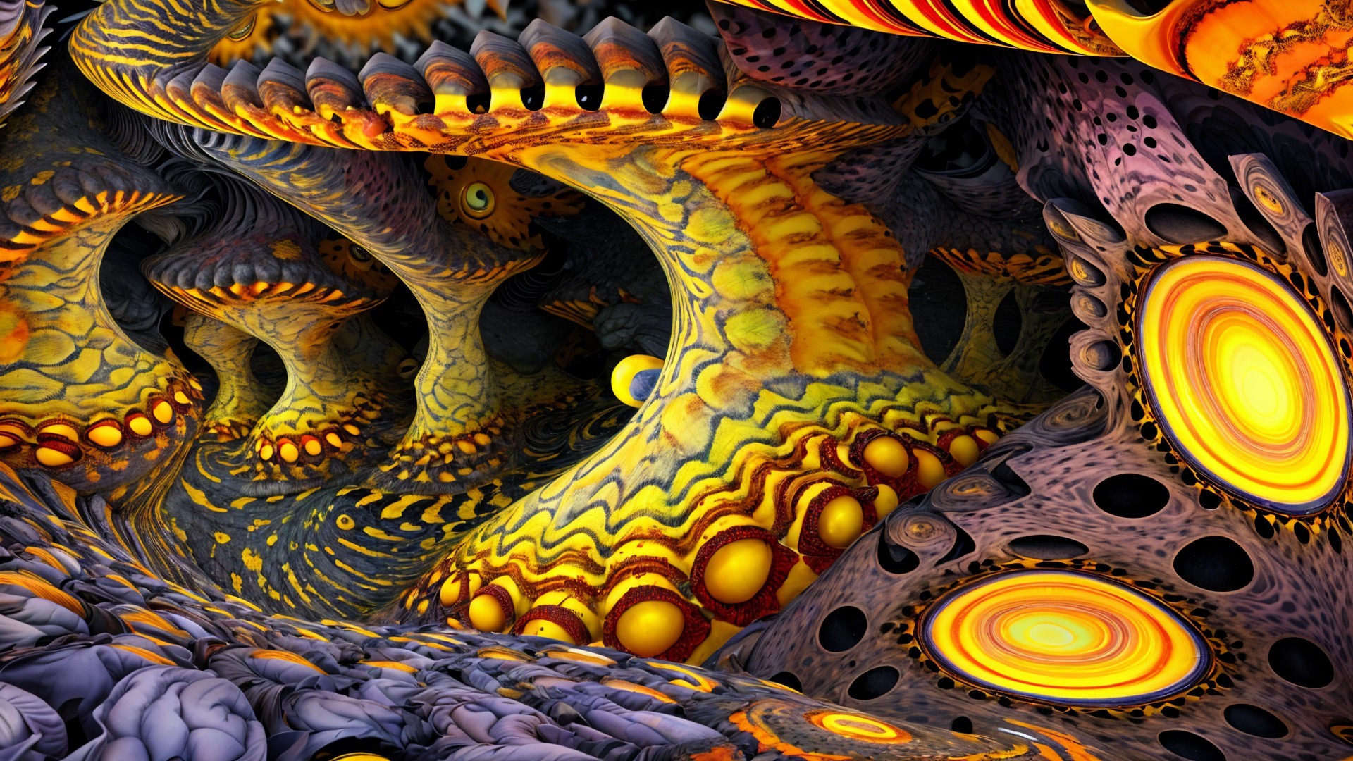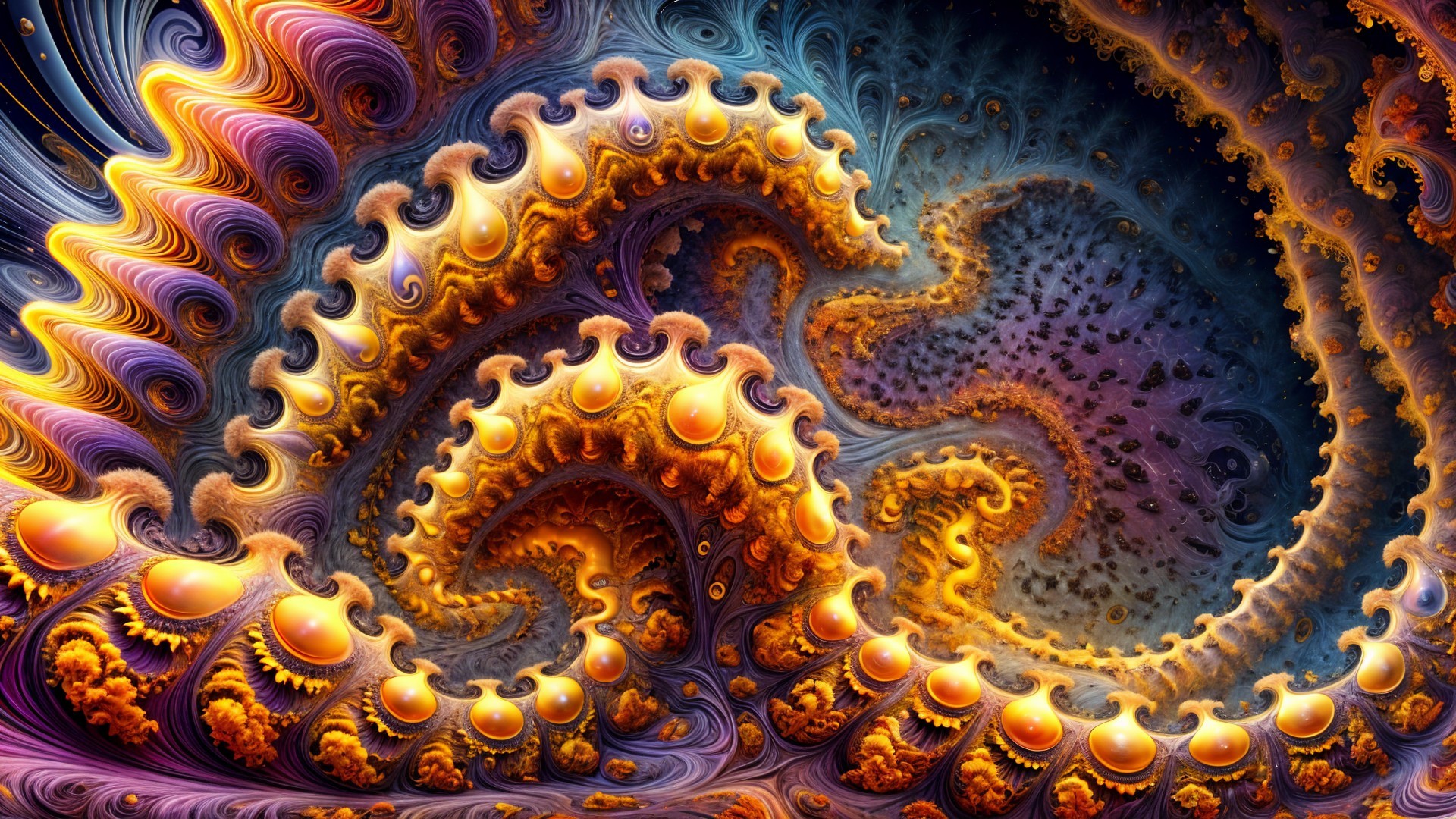 A vibrant, swirling abstract composition featuring intricate patterns of orange, blue, and purple. Organic forms intertwine, resembling fractal designs, creating a mesmerizing effect.