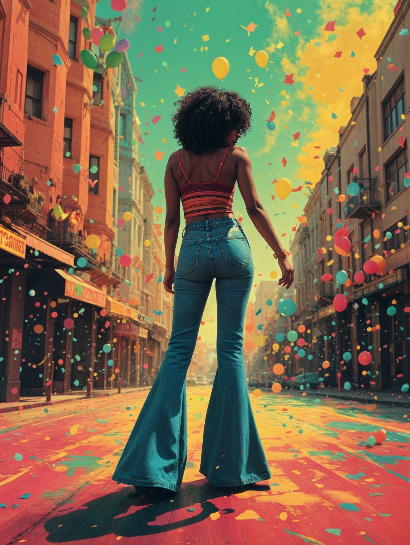 Modifiers : background is filled with an explosion of bright colors and abstract shapes, emphasizing the energy of street culture. The color palette features bold contrasts, combining shades of orange, green, and blue, creating an energetic atmosphere. The entire scene captures the essence of movement and excitement. One third rule. Stunning artgem. Trending top on artstation. Joyyy."