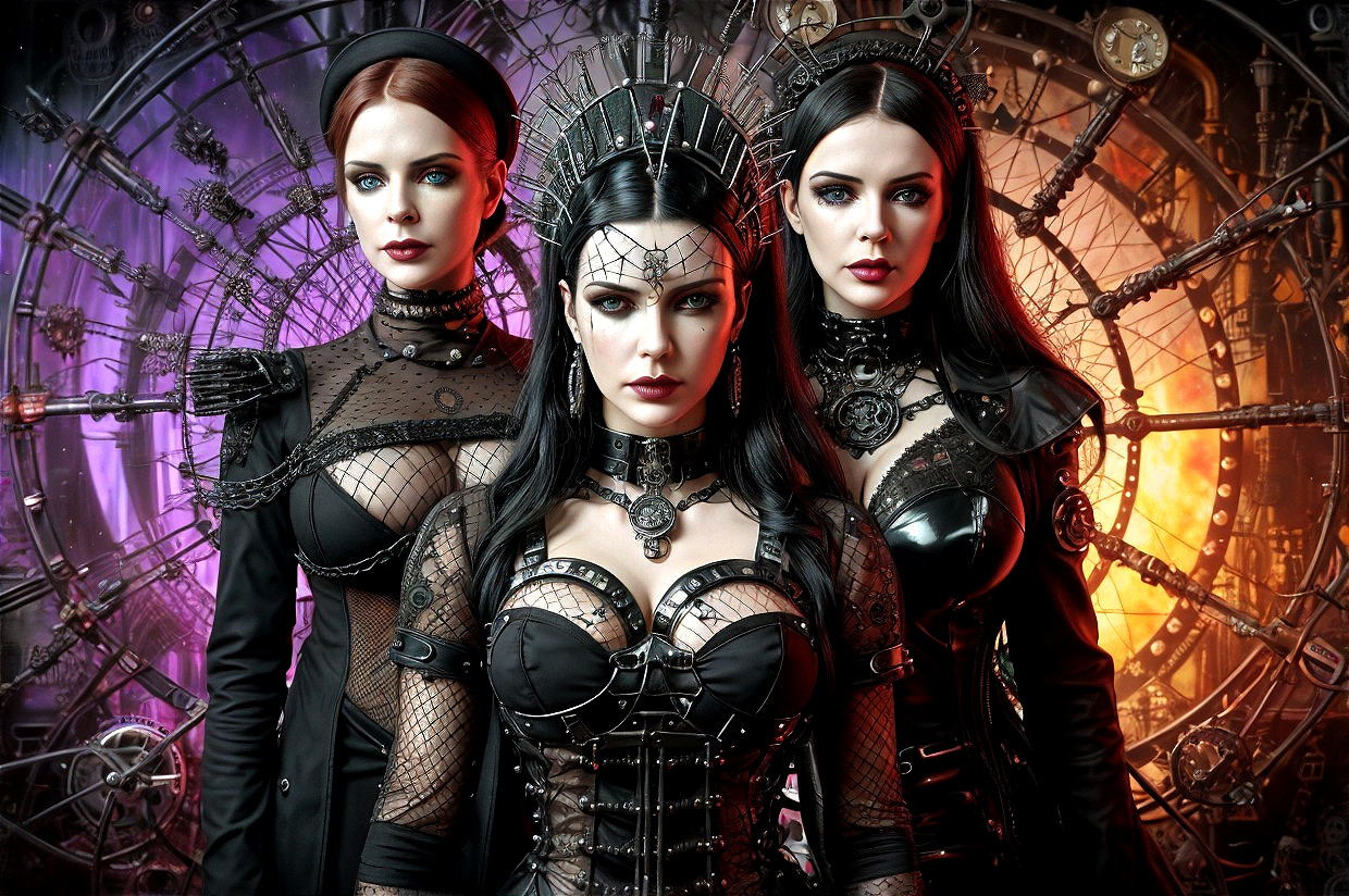 Prompt: Witches of cybernetic beauty, steampunk wire-mesh suits, pipes of hell, hellraiser, pinhead by H.R. Giger, clockwork, razor-wire, merged double exposure mixed media, Gustav Klimt and Bill Sienkiewicz, intricate high detail crisp quality cosmic