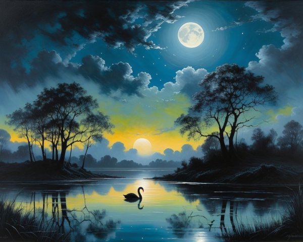 A serene landscape features a flowing stream bordered by vibrant greenery and wildflowers. Majestic clouds paint the sky as a striking sunset casts warm hues, enhancing the tranquil scene.