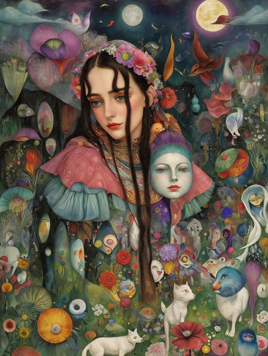 A serene woman with a vintage hairstyle stands amidst a night scene with butterflies and a moonlit village.