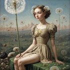 A surreal, otherworldly scene featuring a woman with intricate, organic armor, surrounded by ethereal landscapes and floating structures, evoking a blend of beauty and the bizarre.