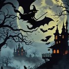 A spooky Halloween scene features a witch on a broomstick silhouetted against a full moon, flying over a haunted castle, bats, and eerie trees, with a misty landscape and glowing windows.