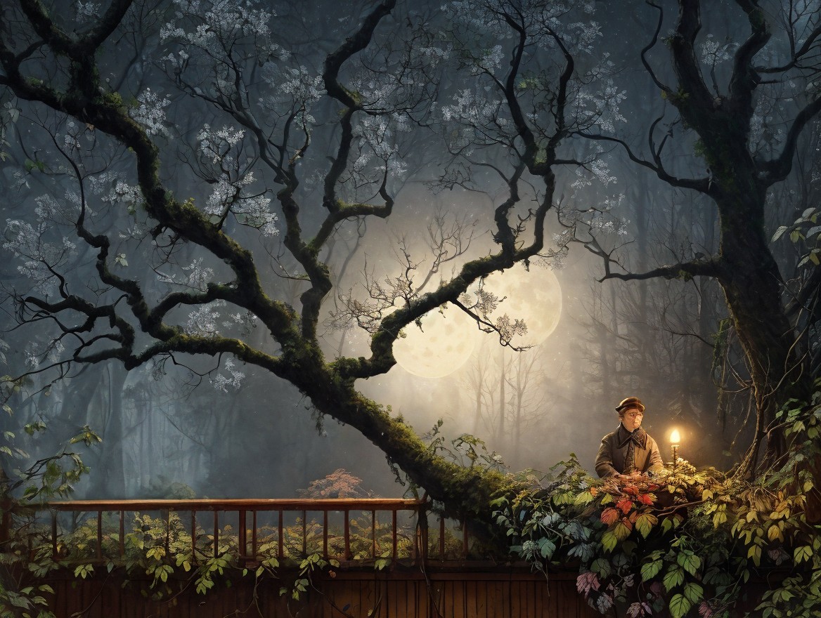+ Prompt:A moon in the mist behind bare branches, flock of flying birds, other sitting on branches with buds, among them rich and dense plants, colorful coleus, seen from an overgrown balcony, extremely detailed, intricate, blinking stars, in the style of Bernard Buffet