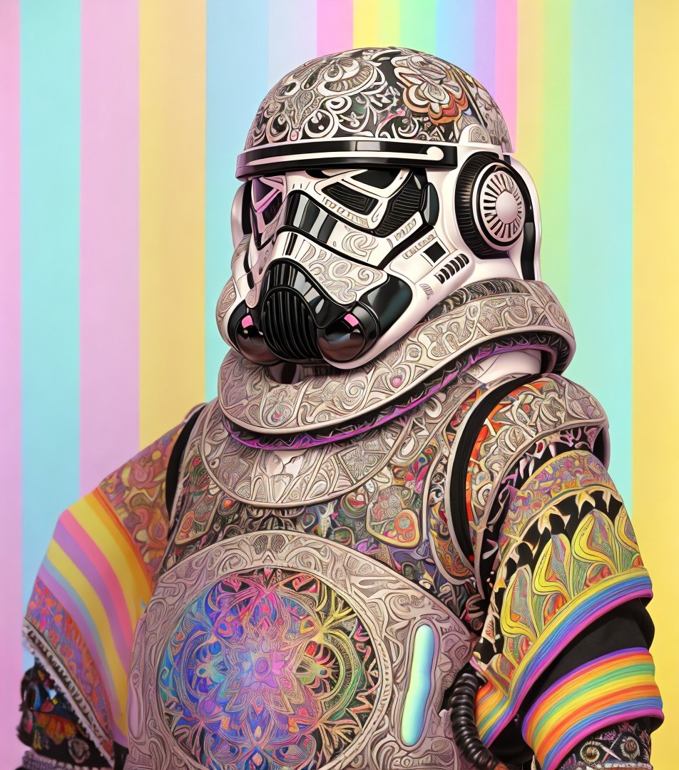 Stormtrooper in front of rainbow tapestry, volumetric lighting, detailed ornamental armor, stylized painting, concept art, dark fantasy art, triadic color scheme white black red, trippy art, acid spill, embossed strokes, (inkpunk, (photorealistic plasticity, volumetric lighting 8:5)), tints of 1970s advertising art, intricate ornamental details, mechanical fittings, psychedelic psychpomp, metallic iridescence, magical realism
