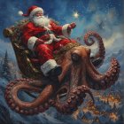 Santa Claus sits atop a whimsical octopus sleigh, surrounded by gifts. The moon shines brightly in a starry sky over quaint, snowy villages, adding a magical holiday charm to the scene.