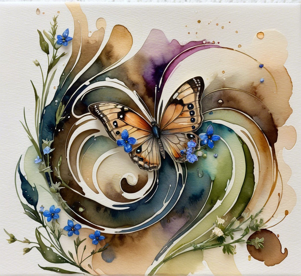 + Prompt:The most beautiful, delicate, intricate watercolor butterfly, intricate details, dreamy, fantasy butterfly, surrounded by tiny blue wildflowers, watercolor and alcohol ink, wet on wet, small splashes and drips