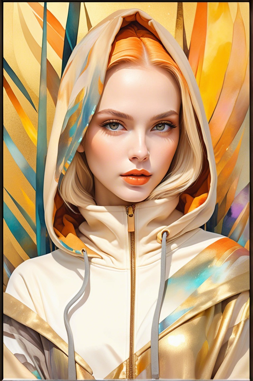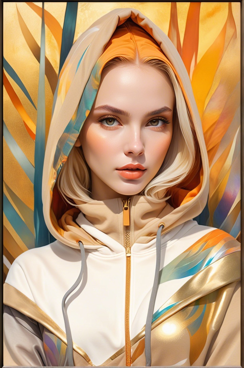 + Prompt:Fantasy art, expressive oil paint brushstrokes with visible textures: a mystical, hues, xeroxed, hokeh effects, ambient occlusion 1.2, dreamlike scene featuring an enchantress, draped in flowing, intricately patterned hoodie with subtle golden accents, vibrant, various colors - deep beige with iridescent sheens, burnt orange with fiery undertones, pure yellow with creamy textures, and sunny yellow, uniquely expressive pop art illustration, with intricate and luminous gazes, swirling background with color shapes, with hints of misty twinkling illumination, emphasizing the colorful character and creating enchantment. The atmosphere is magical, inviting, and deeply connected to coherence, blending elements of fantasy and photography. Inspired by the illustrations of ArlieOpal, the intricate details of Arthur Rackham, the surreal landscapes of hi baron, the fantastical creatures of Gerald scarfe, vibrant colors, opulent fabric textures, dreamy, vintage aesthetic reminiscent of Andy warhol. High contrast colors, metallic paints, geometrical patterns, hallucinatory influence, 3d effects 1.8, dynamic lighting 1.7, parallax occlusion 1.2, octane render illustration 1.5, subtle pastel colors, colorful iridescence 0.7