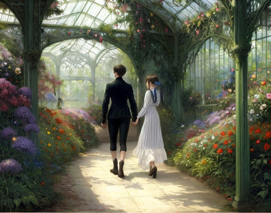 An oil painting depicts a romantic couple exploring a lush, blooming Edwardian greenhouse in a botanical garden. The artwork features intricate and colorful details, inspired by artists like Arthur Rackham and Edouard Manet. The scene exudes a Gothic, fantasy vibe with influences from various renowned painters.