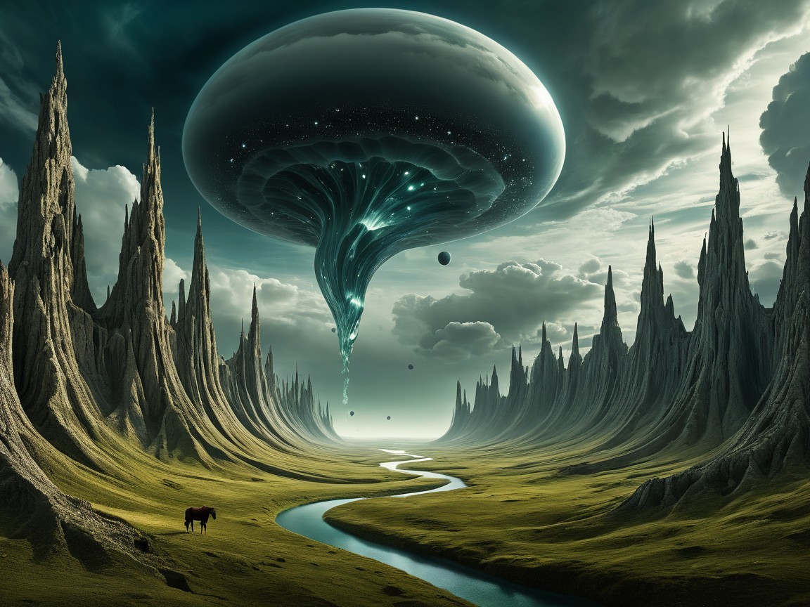 A surreal landscape features towering rock formations and a winding river, with a mysterious, swirling portal above, casting an otherworldly glow in a dramatic, cloudy sky. A lone horse stands nearby.