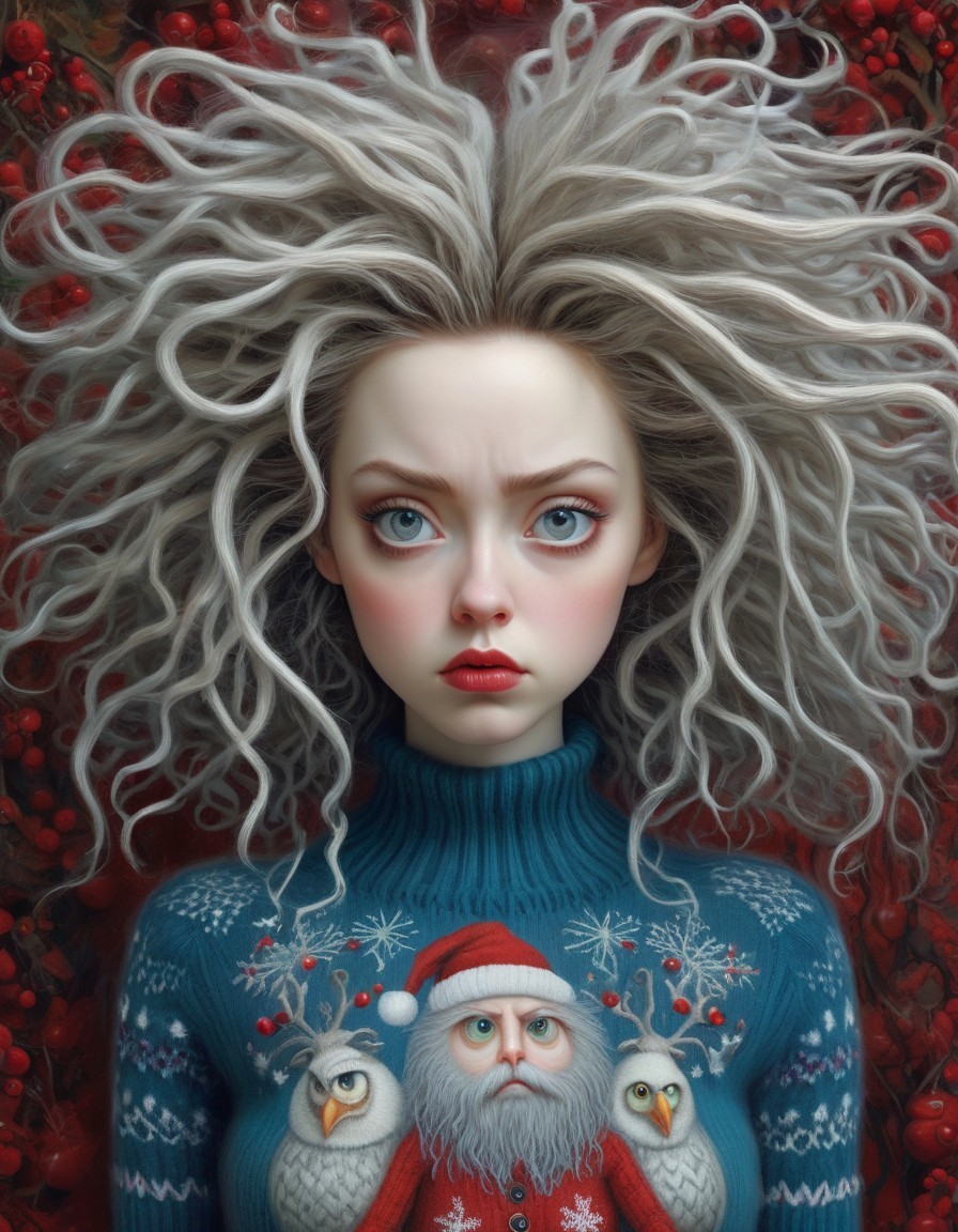 Prompt: "Tim Burton Style, 3D, an Angry woman who wants to take off the Ugly Christmas Sweater he is wearing, (((knitting errors, distorted knitting, knitting holes, surrealistic))), Hyper hypnotically beautiful intense alluring Hyper realistic detailed sad eyes, insanely detailed wild thick hair, By James Jean, Mark Ryden, Brian Froud, Zdzisław Beksinski, H. R. Giger, Hieronymus Bosch, extremely detailed, high definition, crisp quality, unions, Miki Asai Macro photography, close-up, hyper detailed, trending on artstation, sharp focus, studio photo, intricate details, highly detailed, by greg rutkowski"
