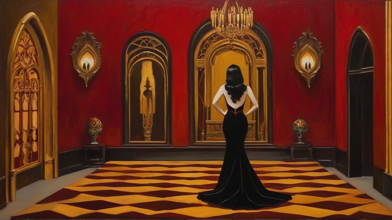 Gothic, Psychedelic, art deco, bordello interior scene.