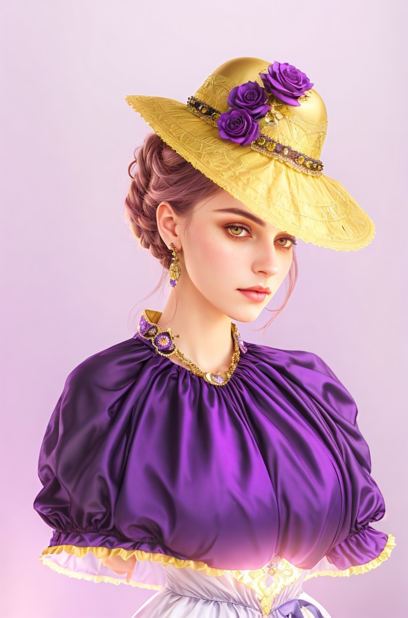 + Prompt:Portrait of female, victorian gothic garments, witty yellow hat, purple lighting, lavish surrounding, rim lighting, bright gothic fantasy art, Dreamy, optimistically upper body with intricate details,