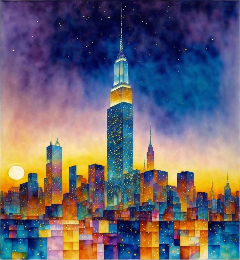A vibrant, starry night sky looms over a colorful, mosaic-like cityscape featuring a prominent, illuminated tower.
