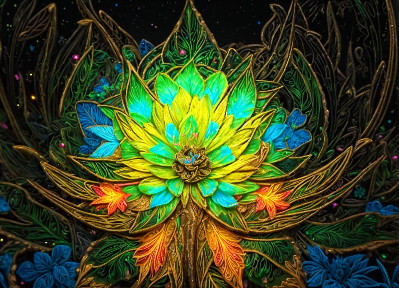 + Prompt:Close-up of a very exotic tropical flower glowing in the night sky, intricate, 3D and textured, velvet layers of petals, neon green stem with small leaves on the edges