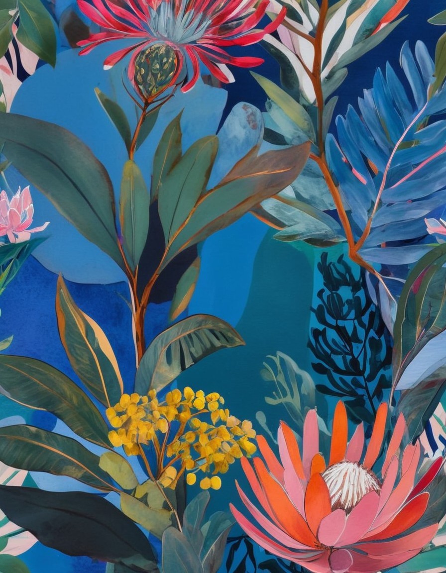 Prompt: Create a detailed semi abstract painting of Australian flowers (Eucalyptus, Banksia, Proteas, and Wattle Tree) in the style of Conrad P Clarke, Wendy Bermingham, Matisse. With edge to edge flowers.