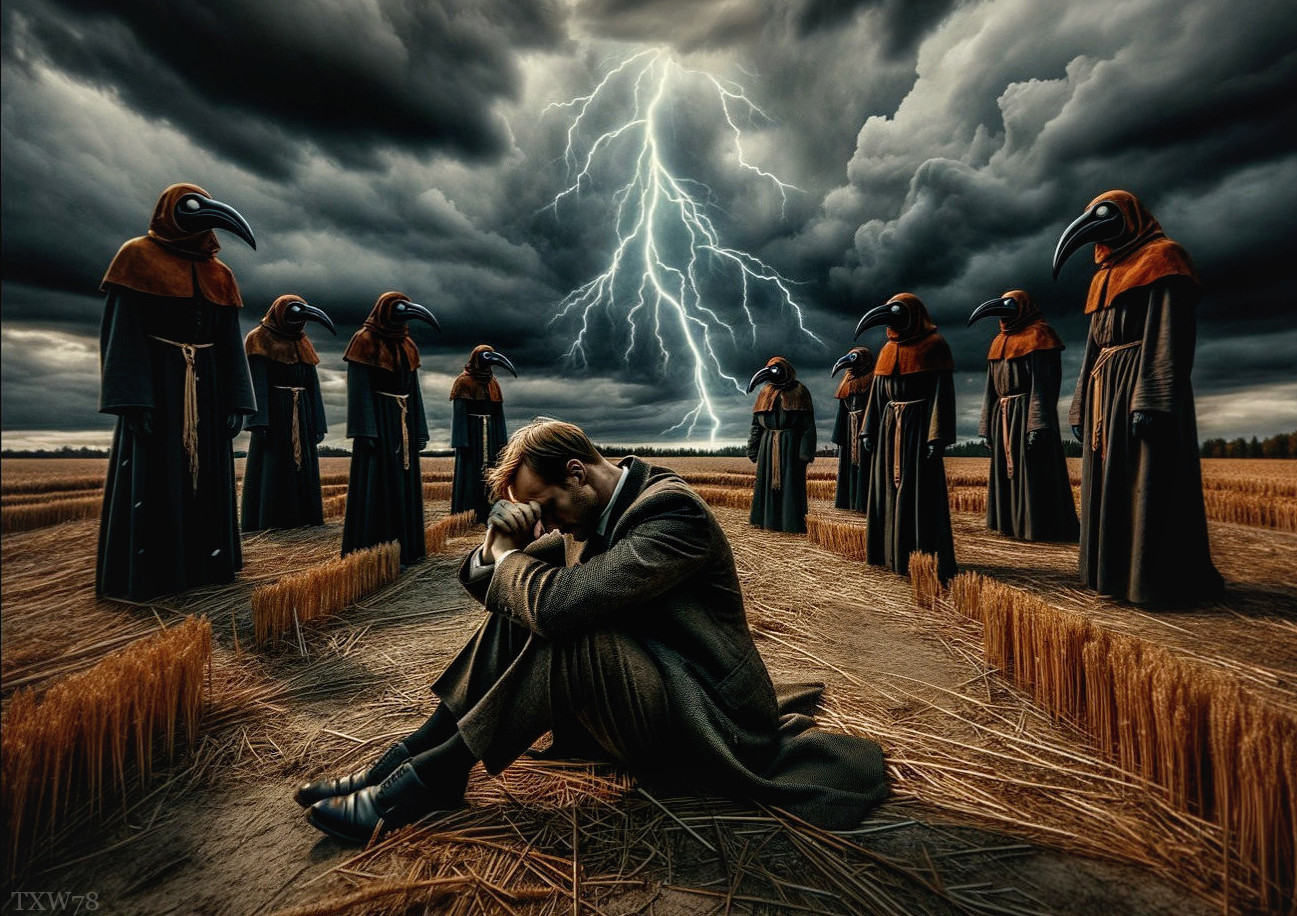 An intense illustration depicting a man in 1920s attire, distressed in a field under stormy skies. Surrounding him are figures in black robes and raven masks, creating an eerie and foreboding atmosphere of impending doom and nightmares.