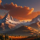 Majestic mountains rise under a vibrant sunset, with peaks dusted in snow and a rich tapestry of autumn colors in the valleys below, creating a stunning natural landscape.