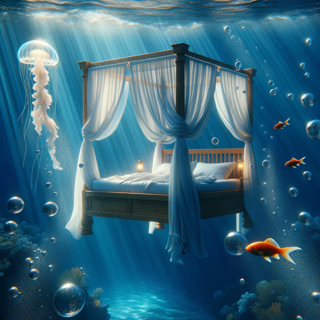 A serene underwater scene features a floating four-poster bed draped with sheer curtains, surrounded by colorful fish, bubbles, and a glowing lantern, creating a dreamlike atmosphere.