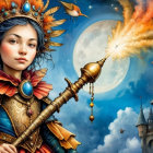 A young woman adorned in vibrant blue and gold, with a feathered headdress and intricate jewelry, gazes thoughtfully. A colorful butterfly flutters beside her, set against a celestial backdrop.