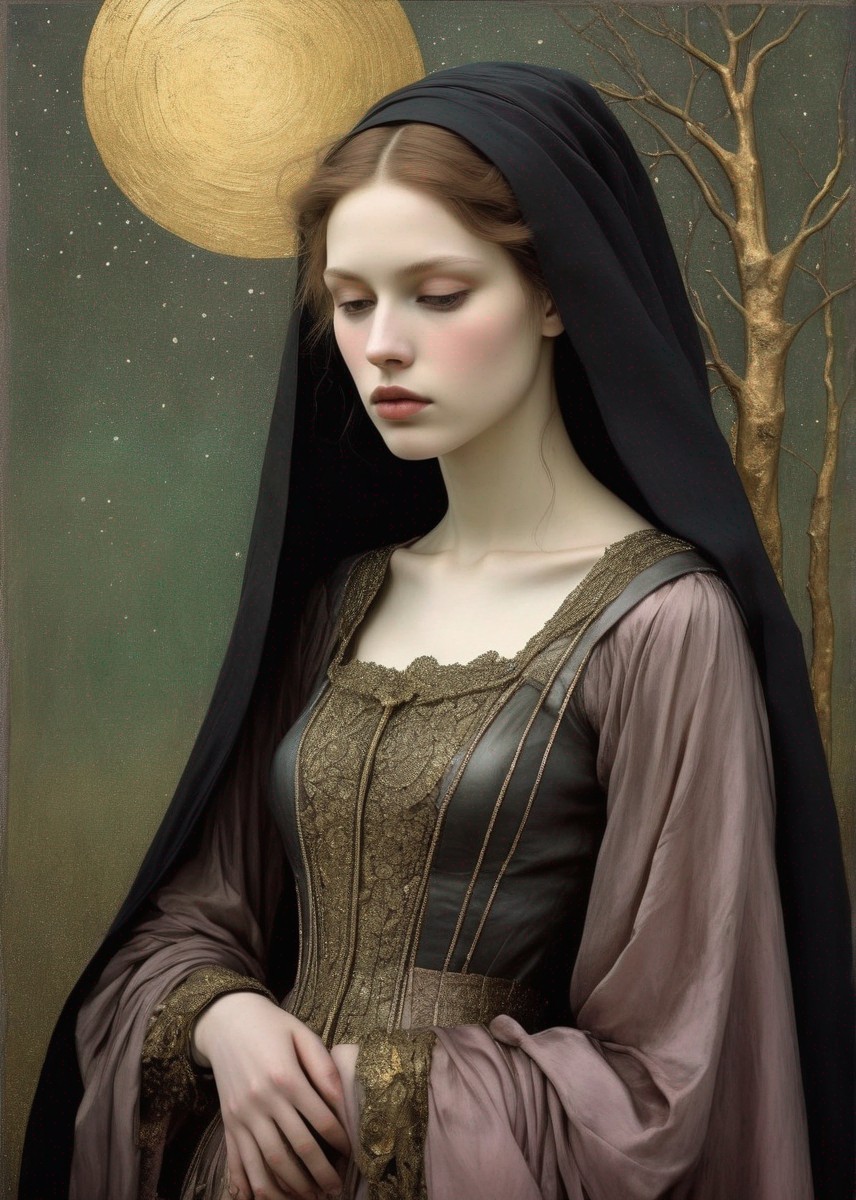 A woman in historical attire with a pink dress and black cloak under a golden halo, adorned with flowers in her hair, appears contemplative.