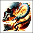 A dramatic scene features a fierce confrontation between a skeletal figure and a fiery dragon. The contrast of blue and orange intensifies the clash between death and mythical power.