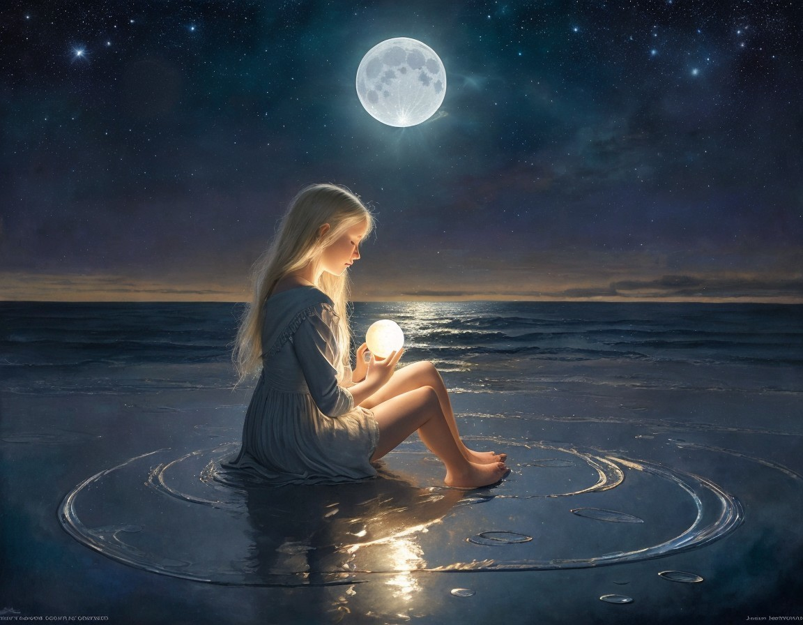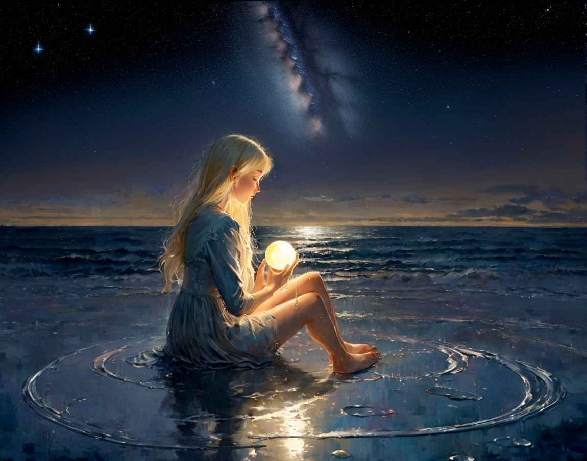 (Try it from other user) - A girl sits by the sea at night, holding a glowing orb with the Milky Way arching above her.