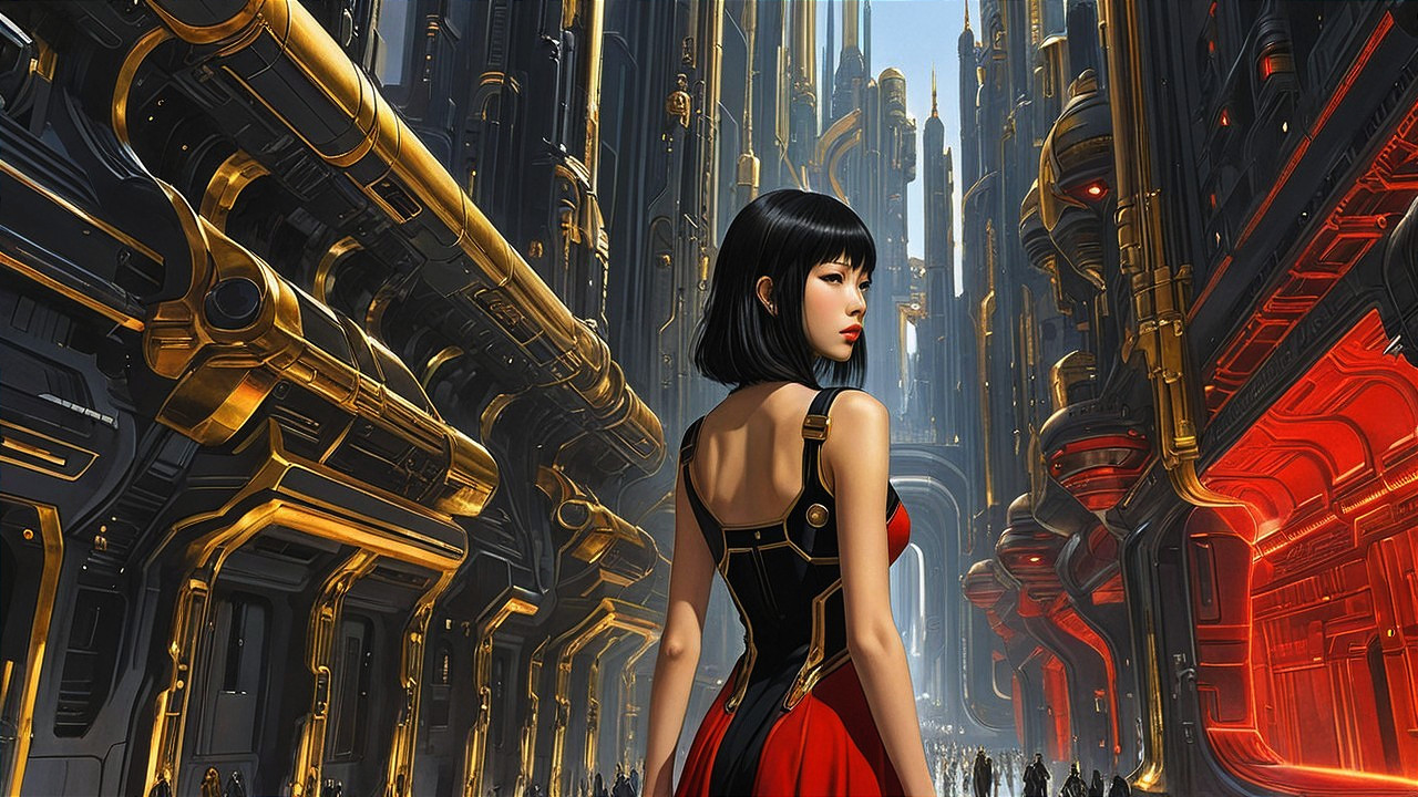 (Try from Rukoed) - A futuristic cityscape with towering metallic structures in gold and red tones. A woman in a sleek, modern outfit gazes back, surrounded by a bustling crowd. The scene is vibrant and dynamic.