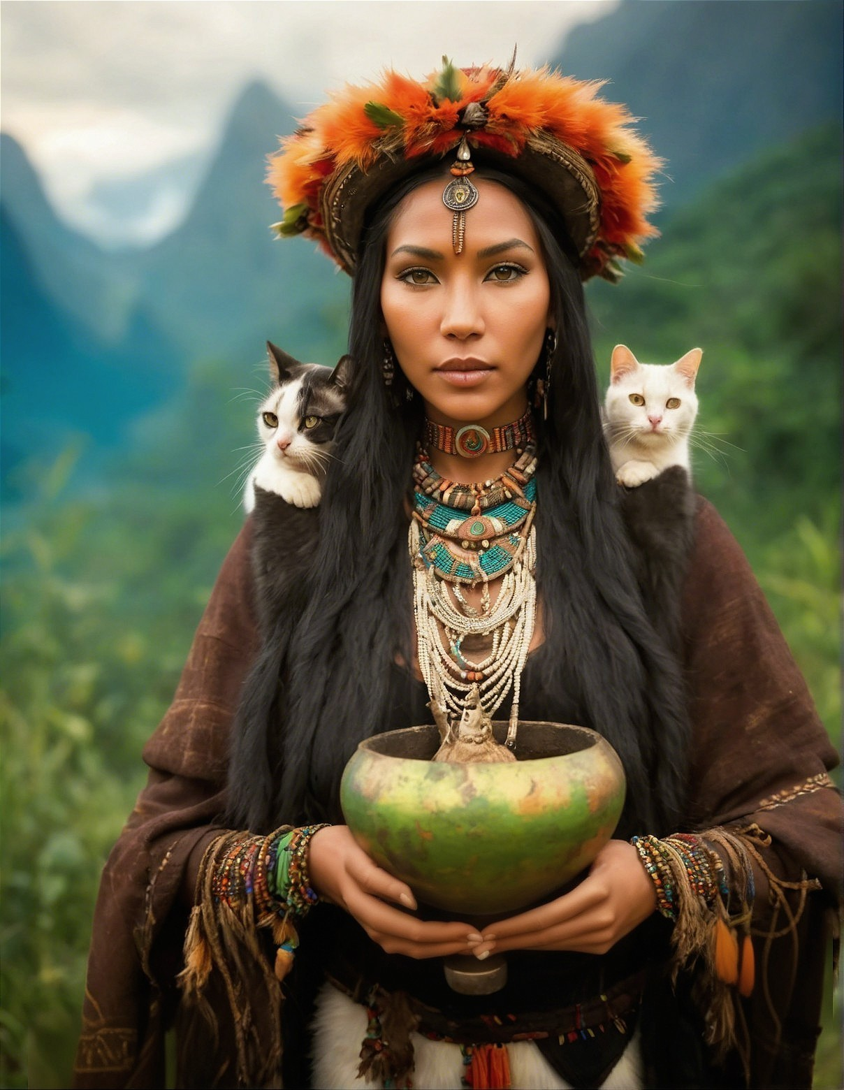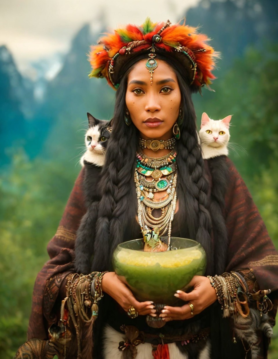 (Old try from other user) - A woman adorned in colorful jewelry and a feathered crown stands in a lush landscape, holding a bowl. Two cats sit on her shoulders, adding a mystical touch to the serene scene.